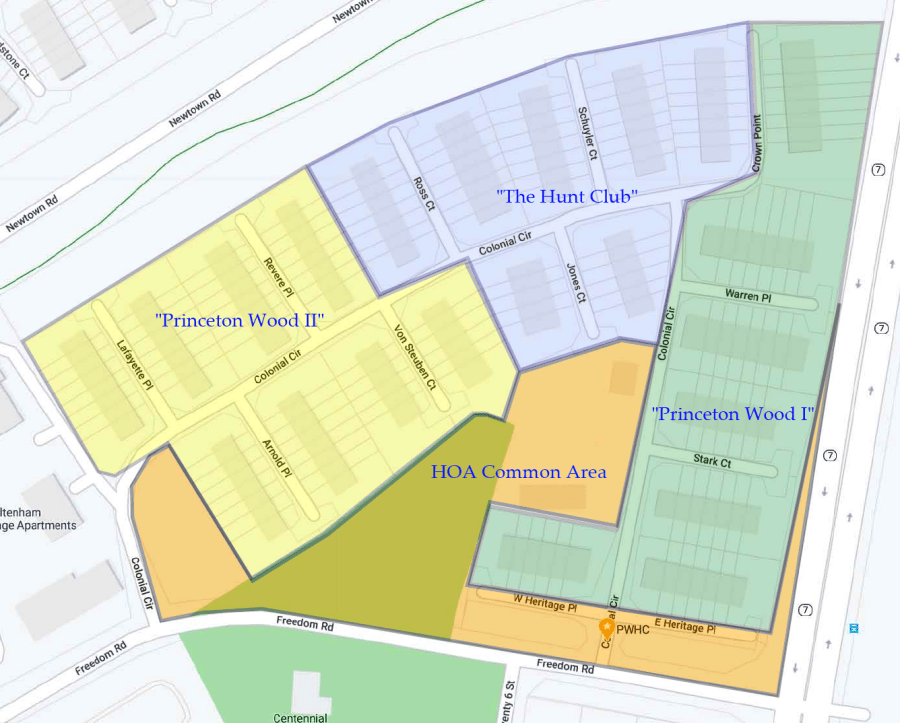 Our community is comprised of 162 individually-owned townhomes built circa 1986 located just off Newtown and Bear-Christiana Rds (Rt. 7). All homes are situated in a development format with the main streets of Freedom Rd and Colonial Circle tying in with a dozen smaller lanes with houses usually clustered in groups of 6 to 8 on each side with lots of open green space!